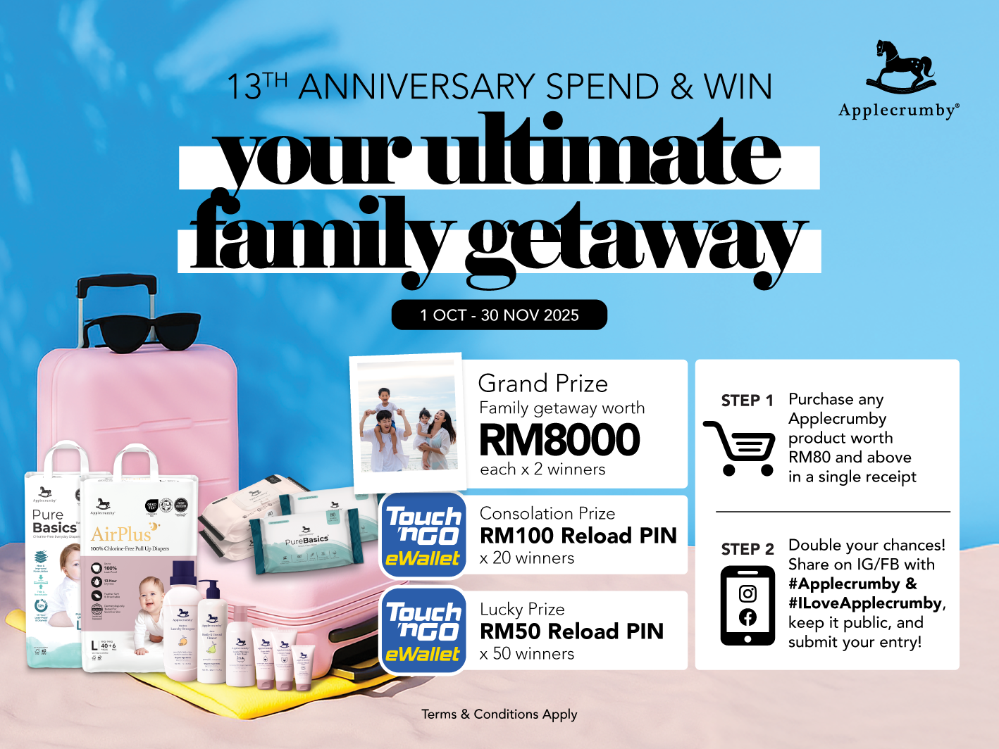 1. Purchase any Applecrumby® products (Baby products e.g. diapers, skincare, wipers, cleaning) worth RM80 and above from any authorized offline stores or online store, within the Contest Period from 01 October – 30 November 2025.