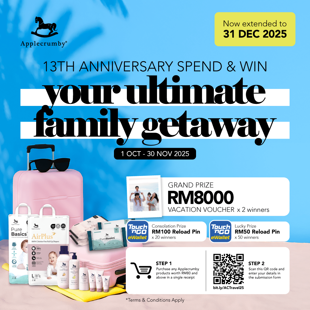 1. Purchase any Applecrumby® products (Baby products e.g. diapers, skincare, wipers, cleaning) worth RM80 and above from any authorized offline stores or online store, within the Contest Period from 01 October – 31 December 2025.